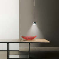 Convivio Pendelleuchte für Innenräume, ideal für die Beleuchtung von Bereichen des Hauses, die der Geselligkeit gewidmet sind, wie Wohnzimmer und Esszimmer. Baldachin aus Aluminium, von dem ein dünnes Kabel abgeht, das in einer kleinen leuchtenden Kugel endet. Optisches Glas, von dem ein homogener Leuchtkegel ausgeht, ideal, um die betroffene Oberfläche richtig zu beleuchten. Convivio ist in LED-Version mit transparenter Linse und Halogen mit satinierter Linse erhältlich, außerdem kann sie als Einzelinstallation oder als Mehrfachinstallation mit 2, 3 Leuchten oder mit dezentralem Licht gewählt werden.