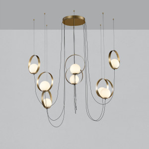 Halo, for example, is a pendant and table lamp that will amaze you with its metal structure and sphere-shaped glass diffuser. Its modern design and black and gold finishes make it versatile and suitable for any furnishing style. If, however, you are looking for a touch of elegance and modernity, Custo is the ideal solution for you. This modern chandelier features a spherical diffuser made of metal and white acrylic. You can choose between gold and black finishes and, if you want an even more spectacular effect, you can use Custo individually or in multiple compositions. Finally, we have Doris, an elegant metal lamp available in both black and gold. Its white glass diffuser creates a welcoming atmosphere, making Doris ideal for the living room or bedroom. With its variations such as chandeliers, wall lights, floor lamps and table lamps, this lamp will adapt perfectly to any environment.