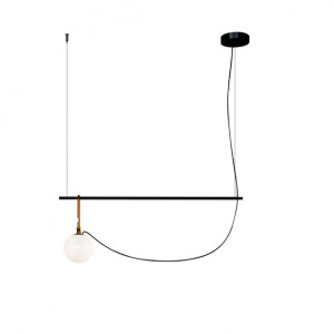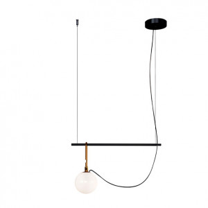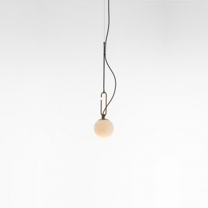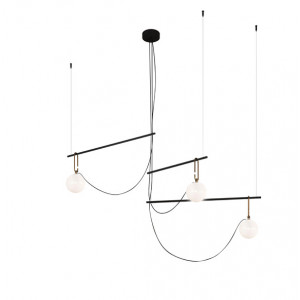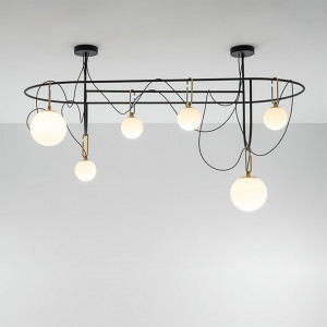 Each lamp consists of a luminous sphere and a brass ring that allows the diffuser to move along a metal axis. Table lamps and chandeliers have been conceived with a view to freedom of movement, to express a new concept of avant-garde lighting.