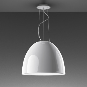 Nur is a collection consisting of suspension lamps and modern style ceiling lamps available in different sizes and finishes. The shape that characterizes all the light points of the collection is the dome shape of the diffuser closed at the bottom by a glass plate. The materials and finishes are different based on the version of Nur referred to. The bestseller version is made of aluminum with anthracite and anodized aluminum finish. Also available in the smaller version, Nur Mini, both suspended and ceiling-mounted. Nur Gloss is available both in the ceiling light and chandelier version. Characterized by a diffuser always in aluminum but with a glossy finish in different colors: Black, white, gray, orange and green. The most particular version is called Nur Acoustic, made with an innovative material that allows the absorption of sound waves, thus allowing greater sound control. Some variants of this collection may be available with LEDs thus allowing greater energy savings. Nur in some versions is compatible with Artemide app which gives the possibility of a customized management of the lamp performance.