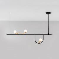 Chandelier with blown glass and bell shaped diffuser. Inside we find a steel structure that recalls a perch, on which there is a luminous body. A small sphere rests on a brass rod with the intent of resembling a swallow in balance. The designers Neri&Hu, with this design chandelier, wanted to give importance to the concept of lightness, creating an illumination that breaks the usual patterns.