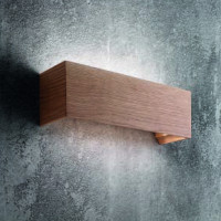 Parallelepiped-shaped designer chandelier with metal and wood structure. The wood tones give a classic feeling of warmth that has always succeeded in making our homes more welcoming. Bi-emission lamp with LED technology, perfect for living areas. Uniformly diffused light.