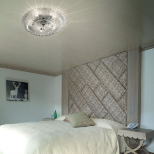 Choosing the size and number of light sources for your bedroom ceiling lamp is essential. In a bedroom of a few square meters, a single ceiling lamp will suffice while if we are already talking about a generously sized double bedroom, a ceiling lamp with higher measures will be needed and perhaps with more than one light point that can be directed as needed. Another element to consider is the height of the ceiling. Low ceilings prefer modern ceiling lights for bedrooms with an almost non-existent thickness, while higher ceilings allow you to play with ceiling lamps with larger and more elaborate diffusers.