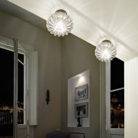 Diamante is a design spotlight characterized by a diffuser in transparent blown glass and handmade. The diffuser has an accurate workmanship that makes the glass shiny. It is available in two different colors, crystal or topaz. This ceiling lamp is ideal for lighting both private and commercial environments.