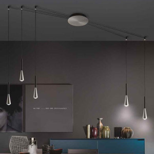 Iconic is a family of contemporary lamps that mix geometric balance and essential figures. Available both as a table lamp, floor lamp and as a suspension, Iconic differs from any other light body for its structure with three different geometries: a cylinder, a cone and a luminous sphere. Therefore it not only diffuses the lighting but also becomes a design element to keep in your own homes. These contemporary chandeliers are ideal for areas such as the bedroom or your own living room. The table lamp version is distinguished by the possibility of rotating the diffuser, directing the light beam in an arbitrary way. Likewise, the Iconic floor lamp has two light beams that can be directed at will. Iconic suspension lamp, on the other hand, is available with a different number of lighting sources: in fact it is available with 3, 5, 6, 8 LED lights, which you can choose according to the size of your home. These contemporary chandeliers are available in different finishes: white, black, steel / black and brass / black.