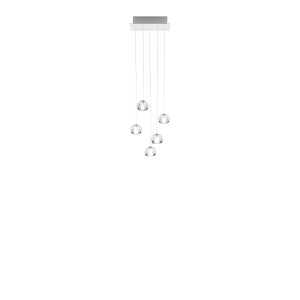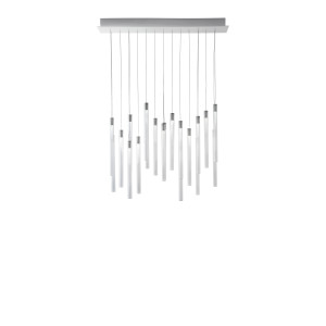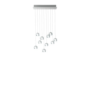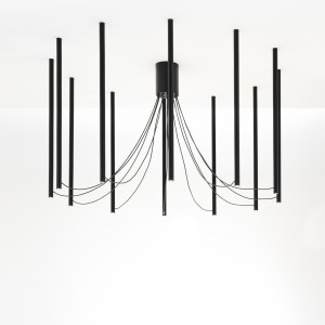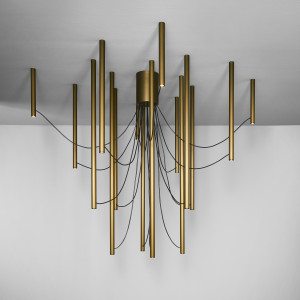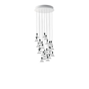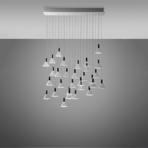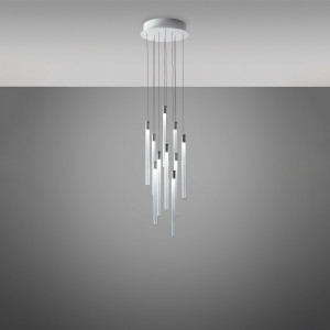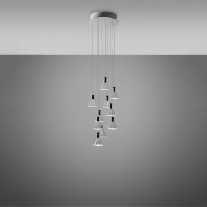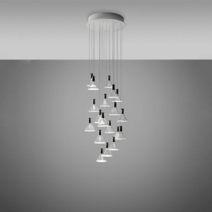 Multispot is a collection of modern chandeliers that differ from each other in the shape of the diffuser. Beluga, Polair and Tooby are the three versions available. The first with a round glass diffuser, Polair features conical diffusers in transparent glass, sandblasted at the bottom, while Tooby features a matt white glass diffuser with a cylindrical and elongated shape. All three versions can be chosen in different sizes with one or more light points and structure in different finishes, anodised or coppered aluminium, black and copper. With the ability to choose between a round or rectangular rosette, Multispot adapts to any environment, be it domestic: living rooms, bedrooms or dining rooms, or contract: such as restaurants or in a reception, for a definitely scenic effect.