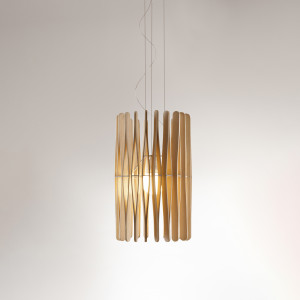 Stick is a collection of modern lamps with an eye on sustainability. In fact, all the lamps in this collection feature a wooden diffuser. This particular finish makes the lamps suitable for modern environments, giving them warmth and character. This collection derives from a module made of Ayous wood whose shape is inspired by that of a pair of pliers: two angled elements extending from a central support. This element repeated circularly leads to the formation of the diffuser. The latter is available in two different shapes, cylindrical or conical. This collection consists of pendant lamps, table lamps and floor lamps, all ideal for lighting living rooms, dining rooms and bedrooms with modern, sophisticated and sustainable furnishings. The Stick collection is available both in the halogen version but also in the LED version for significant energy savings.