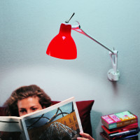 Lamp inspired by technical lighting equipment with pivoted arms. The movement is made possible by torsion springs hidden in the joint. The glass diffuser is coated with color paint. To be applied to the wall or the ceiling.