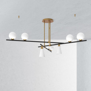 The Linee collection includes modern chandeliers that feature recurring, rounded, spherical, tubular or conical geometries. All the lamps in this collection are composed of slender static structures, which end at the end of the light body with a lamp with a different shape. They reproduce order and linearity, based on an essential modernism of forms. Part of this collection are Adam, Alice, Anna, Emma, ​​Juri, Kevin, Mikado, Tolomeo and Vienna. The diffusion of light takes place in a direct and homogeneous way and in no case leaves any shadow areas inside the room in which they are positioned. These modern chandeliers combine perfectly with large spaces, such as open spaces in a home, or in an office or meeting room. They are recognized for their metallic finishes, mostly brushed brass or painted metal and for the presence of several light points in the same lamp. These modern chandeliers become the protagonists of the room in which they are applied.