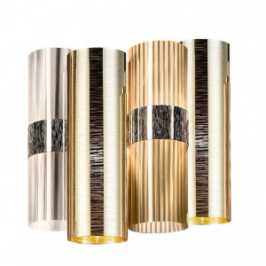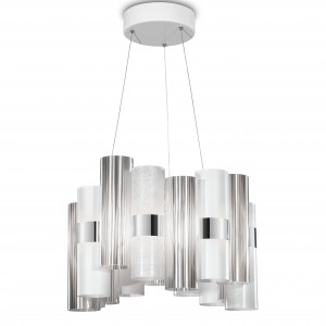 Lollo includes design lamps with large dimensions and precious finishes with iridescent and shiny colors. The collection is inspired by the 50s, tells of a retro design but made with new, innovative and performing materials. These lamps are characterized by diffusers consisting of a series of technopolymer cylinders arranged around a luminous ring with an alternation of prismatic and metallic colors, lace, geometric designs and contemporary color gradients. Proposed in two versions, one smaller in size and circular in shape, the other in a chandelier version, much more scenic and suitable for lighting hospitality and commercial spaces, large domestic spaces. Also available in wall lamp version. La Lollo lamps are handmade, the cylinders have the same brilliance as glass and are unbreakable. They have LED light sources, guaranteeing optimal lighting in any context.