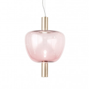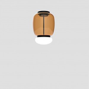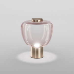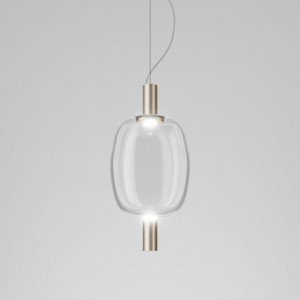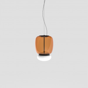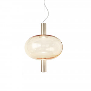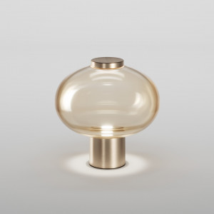 Riflesso groups design lamps characterized by blown glass diffusers with a rounded and sinuous shape. These lamps were designed by the two designers Chiaramonte and Marin, expert in manufacturing techniques of blown glass who have rethought the diffuser as a light and reflective element, to enhance the brightness of the LED light source. Riflesso lamps are available both in table and suspension versions. The chandelier is proposed in three different forms, completely transparent or in amber, light amethyst and Fumè. Furthermore elements such as the ceiling rosette and the cylinders enrich the lamps with precious golden or satin copper colors. Version of the table lamp is available in only one of the shapes provided for the chandelier and in two colors: light amethyst or transparent. Riflesso lamps are ideal for illuminating various types of environments from the night area to the living area.