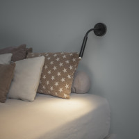 Lampada da parete orientabile a luce LED, ideale per illuminare comodini o scrivanie, disponibile in versione bianco e nero. La montatura è realizzata in metallo laccato, decorato in gomma di colore bianco o nero. Il driver è incluso. Nessun interrutore integrato.