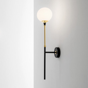 Galassia lampada da parete è proposta sia a luce singola sia due luci orientate verso destra o sinistra, riprende lo stile della sospensione con la struttura in ottone dorato e le sfere in vetro soffiato triplex bianco.