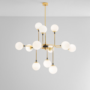 La versione lampadario è caratterizzata da una struttura metallica con finitura dorata e dettagli color nero con diffusori sferici realizzati in vetro soffiato triplex bianco. Disponibile in due diversi modelli: da dodici e sei punti luce.